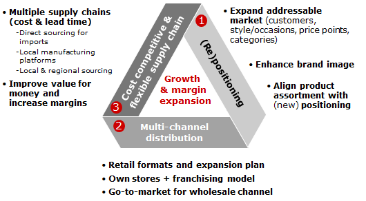 • Go-to-market: Multi-channel distribution with stores, franchises and wholesalers