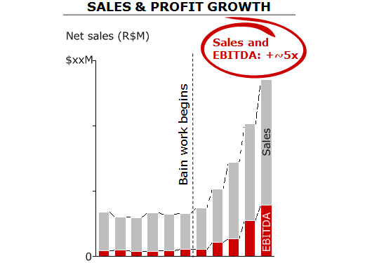 Bain and ClothingCo teams came together to deliver fivefold sales and profit growth while the company also experienced a more than +60x increase in its stock price. The Profit from the Core approach helped ClothingCo identify substantial opportunity for organic growth, creating value out of its strong, but underutilized, brand.