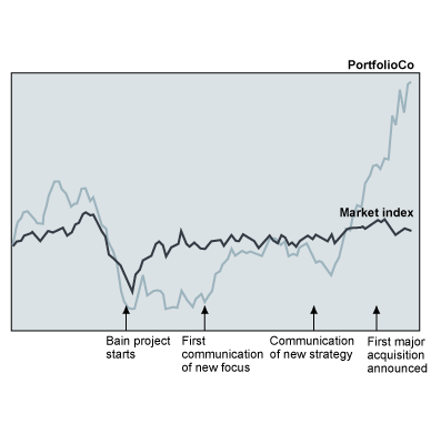 PortfolioCo asked Bain to help develop a new corporate vision to achieve overall growth and reverse the decline in the company's stock price.