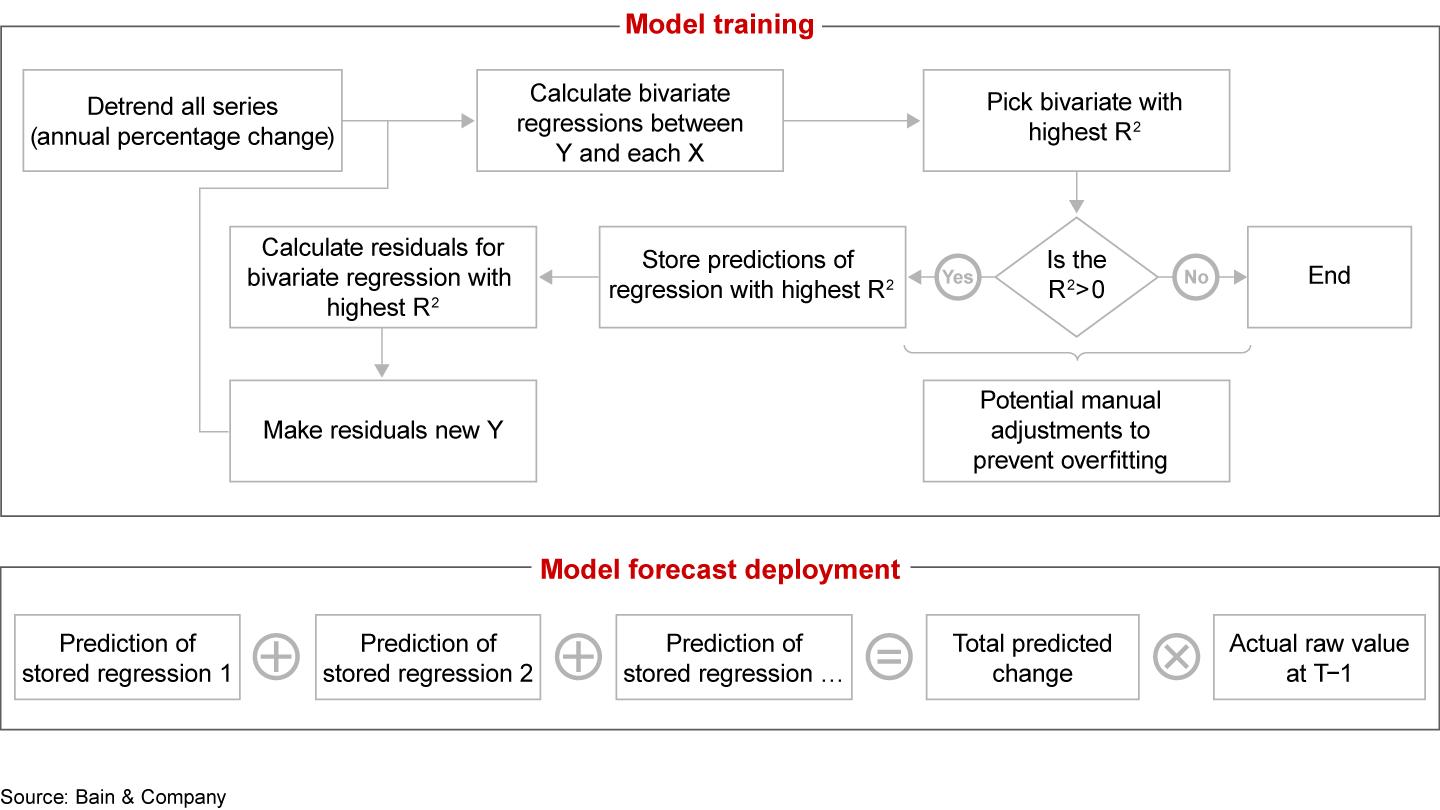 The candidate set of testable predictors included a mix of economic indicators, such as gross domestic product and disposable income, along with product-specific data. For instance, in auto insurance, we included data such as the number of vehicles purchased, whereas in property insurance, we relied on housing- and rent-related predictors. For all these predictors, we already had forecasts from external sources such as Oxford Economics and Euromonitor, thus we could project their historical impact in the future. As these forecasts included Covid-19 effects, they set up the model to cover developments created by the pandemic shock as well as likely recovery patterns.
