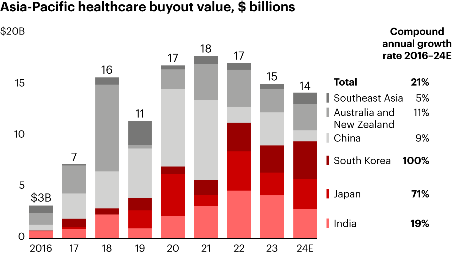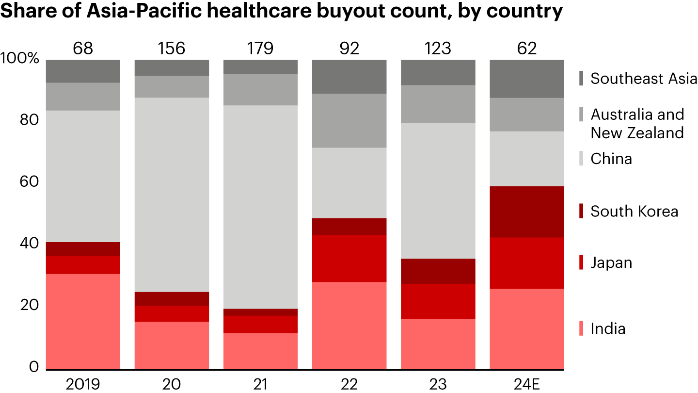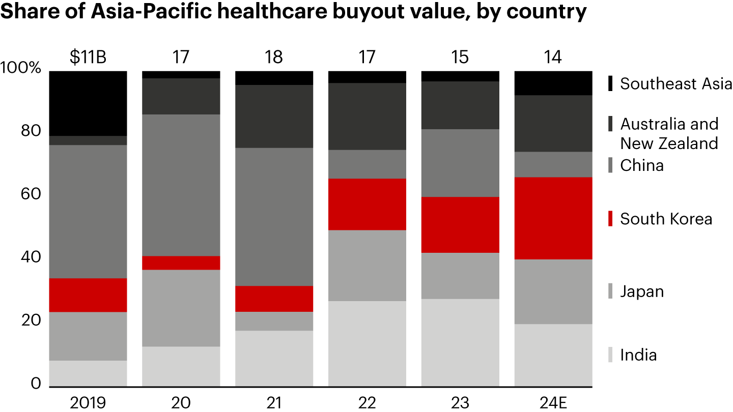 Many medtech companies attracting PE investors in the region typically focus on offerings with global markets in segments such as aesthetic skincare and dental health. For example, aesthetic device maker Jeisys Medical was recently taken private by Archimed. South Korea’s healthcare landscape is also opening up for investments in derivative and adjacent businesses. For example, MBK Partners acquired Geo-Young—a pharmaceutical wholesaler serving pharmacies, hospitals, and medtech companies—from Blackstone.