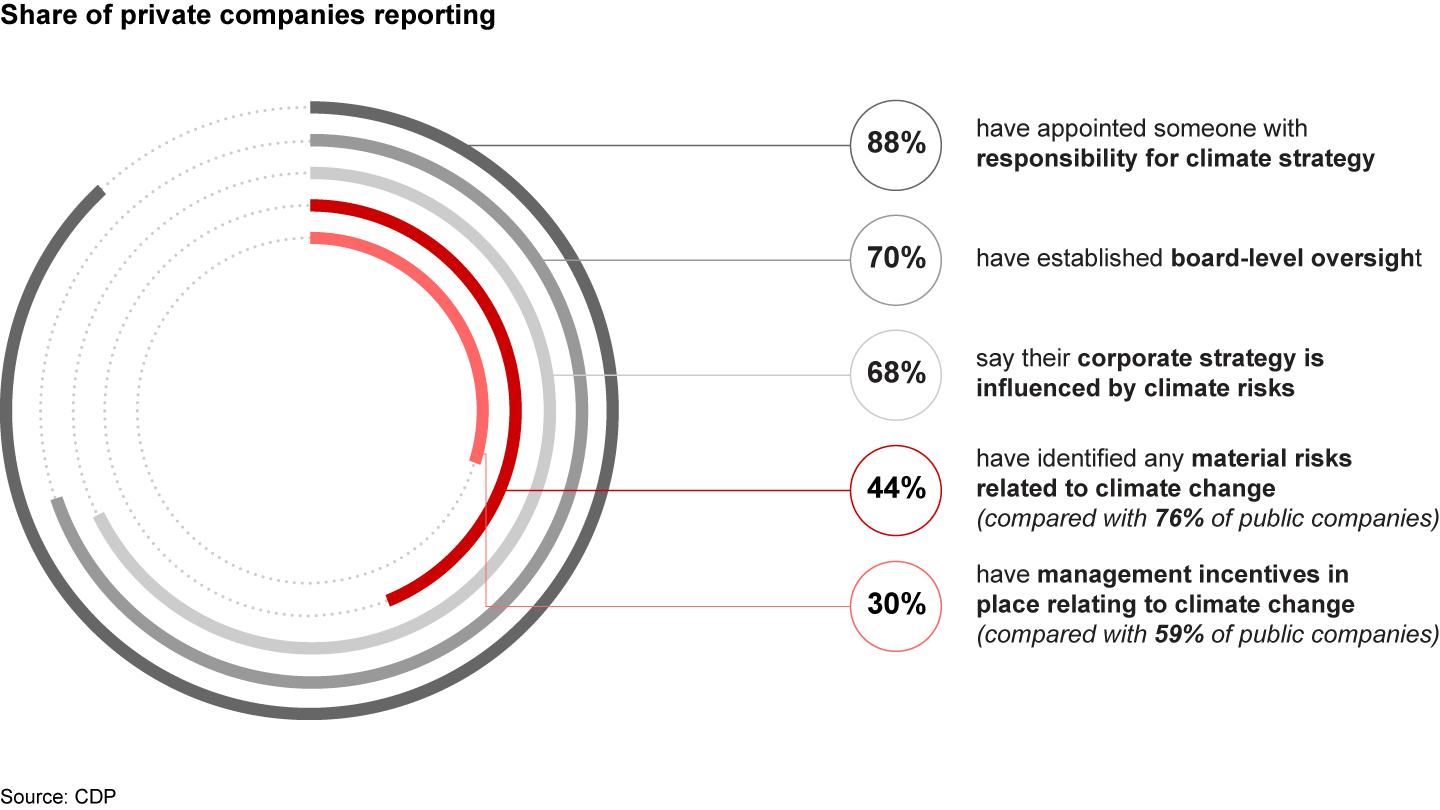 Private companies aren’t ignoring the climate issue. Many have taken important steps toward institutionalizing oversight of their climate-related performance. A full 88% say they have appointed someone with responsibility for climate strategy, and 70% have established board-level oversight.