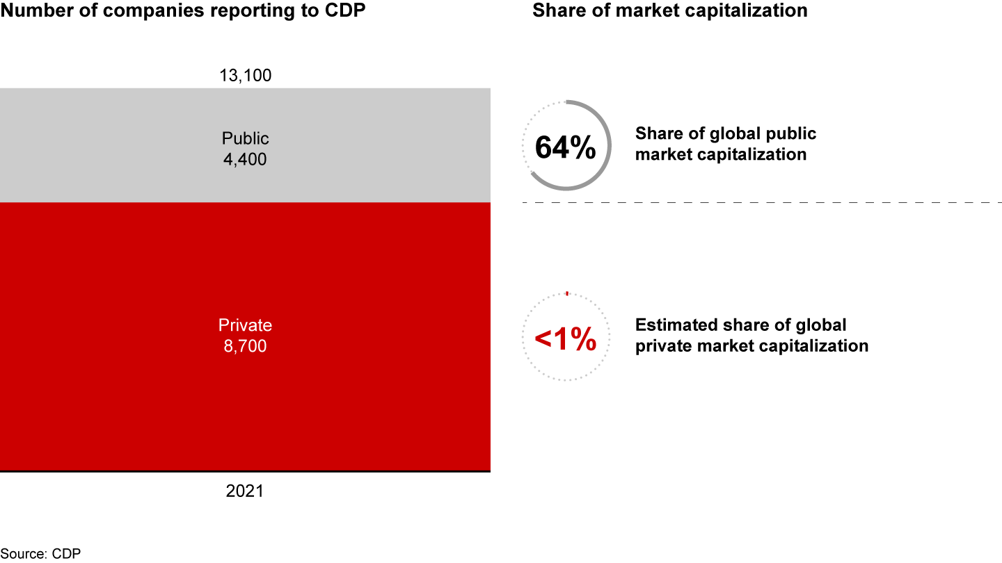 More than 13,000 companies, a third of which are public entities, report to CDP on environmental and climate impacts. Yet while the 4,400 public companies in CDP’s database cover 64% of global public market capitalization, the 8,700 private companies that report represent a tiny fraction of private market capitalization globally (see Figure 1).