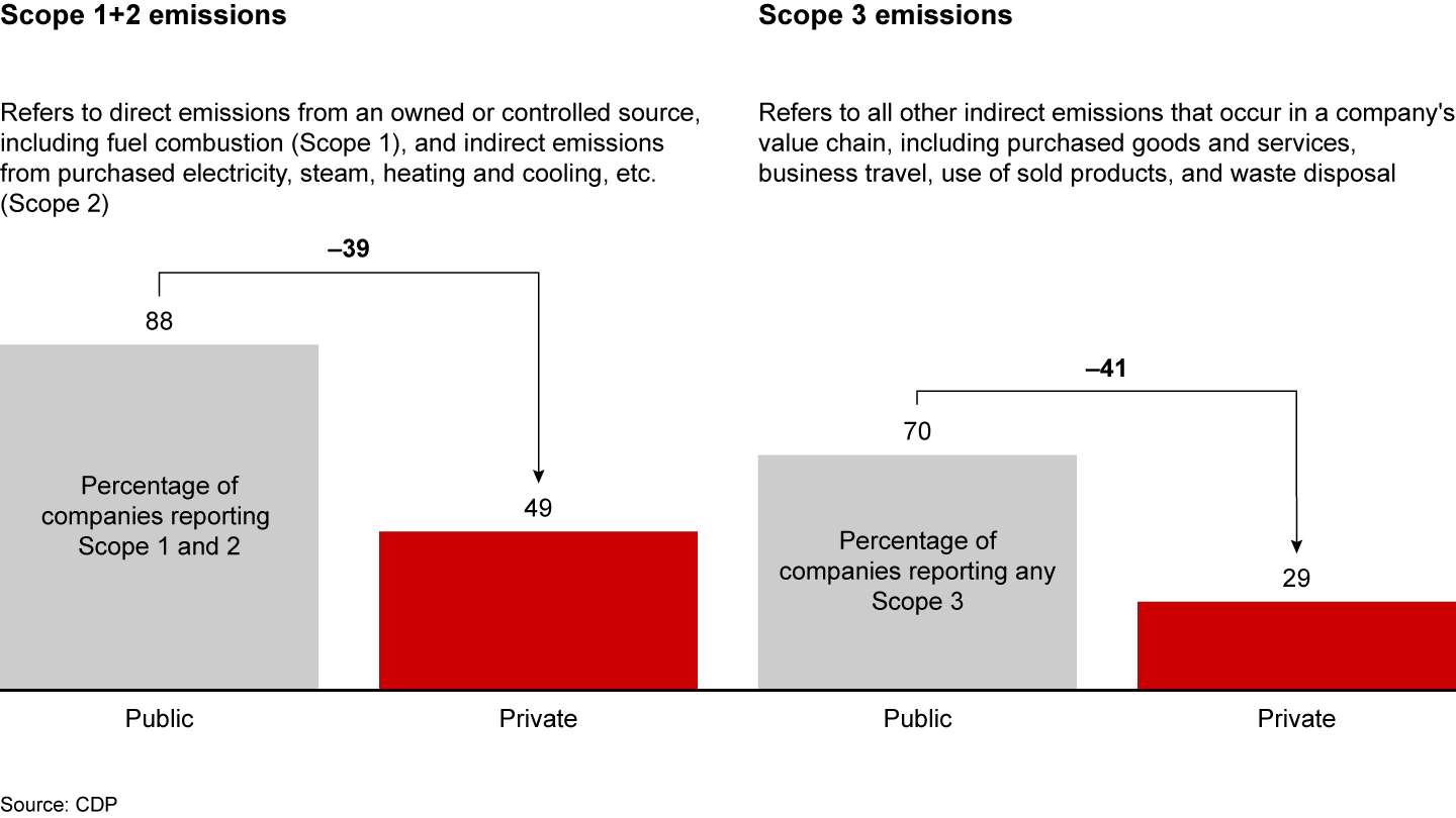 Those forces—especially regulation—are likely to be the most powerful factors in closing the reporting gap between public and private companies. But it will also be critical for reporting itself to mature. The Bain-ILPA study shows that a lack of specific data standards and best practices related to ESG is clearly hampering PE investors’ ability to consistently evaluate ESG performance across their portfolios. CDP finds that private companies are generally enthusiastic about seeking solutions and are responsive to reporting requests, especially from investors. Finding easier ways to comply appears to be the bigger conundrum.