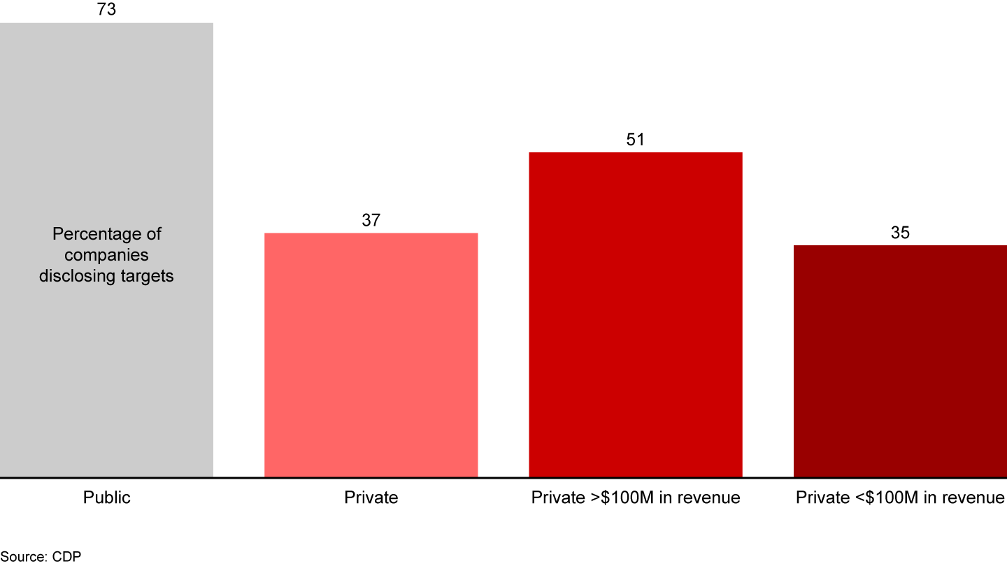The gap also extends to ambition. While 73% of public companies actively set emissions reduction targets, just 37% of the private enterprises do. Larger private companies (those with more than $100 million in revenue) perform somewhat better than smaller companies in this planning function. But still only 51% of them reported setting any targets (see Figure 3).