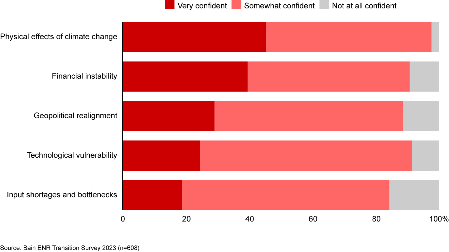 These narrow approaches can leave blind spots and create a false sense of security. Bain recently asked executives about their confidence in navigating five types of threats, spanning from the physical effects of climate change through to technological vulnerabilities, input shortages, and bottlenecks (see Figure 1). Confidence across the board appears surprisingly high, especially as many of these threats continue to escalate.