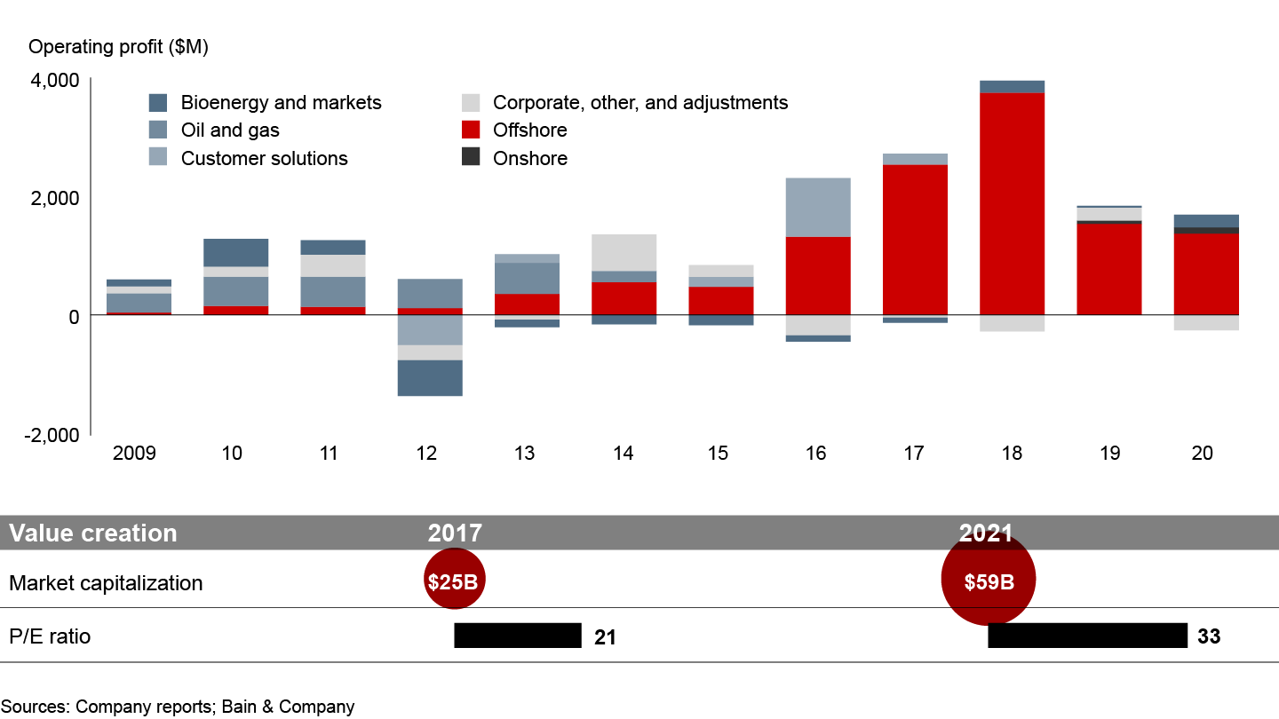 In Denmark, the state oil and natural gas company, Dansk Olie og Naturgas, found that shareholders, customers, and other citizens were increasingly hostile to large carbon emitters, putting its long-term existence in doubt. In the first decade of the 2000s, after having already increased its presence in power generation and distribution, its leaders adopted a climate strategy that eventually led it to recapitalize the company, divest its oil and gas assets, and invest heavily in wind farms. Now rebranded as Ørsted, the company is a global leader in renewable energy delivery, with nearly all of its profits from wind (see Figure 6).