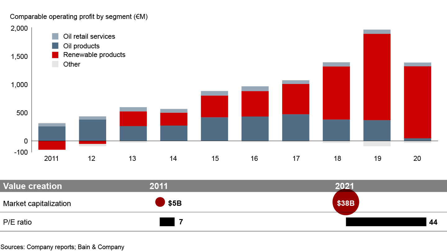 In Finland, refiner and chemical producer Neste has invested in innovative technologies and business lines to become the world’s largest producer of renewable diesel fuel. More than a decade ago, Neste’s leadership recognized the mounting risks of depending on traditional petroleum products as the fuel source of the future. Predictions of peak oil weren’t just academic; they spelled the end of growth. In response, the company invested in technologies to produce diesel from renewable sources. Renewable diesel now furnishes most of Neste’s profits, but its eightfold increase in market valuation over the past decade results not only from this major new business line, but from other prospects stemming from it, including alternative aviation fuels (see Figure 5).