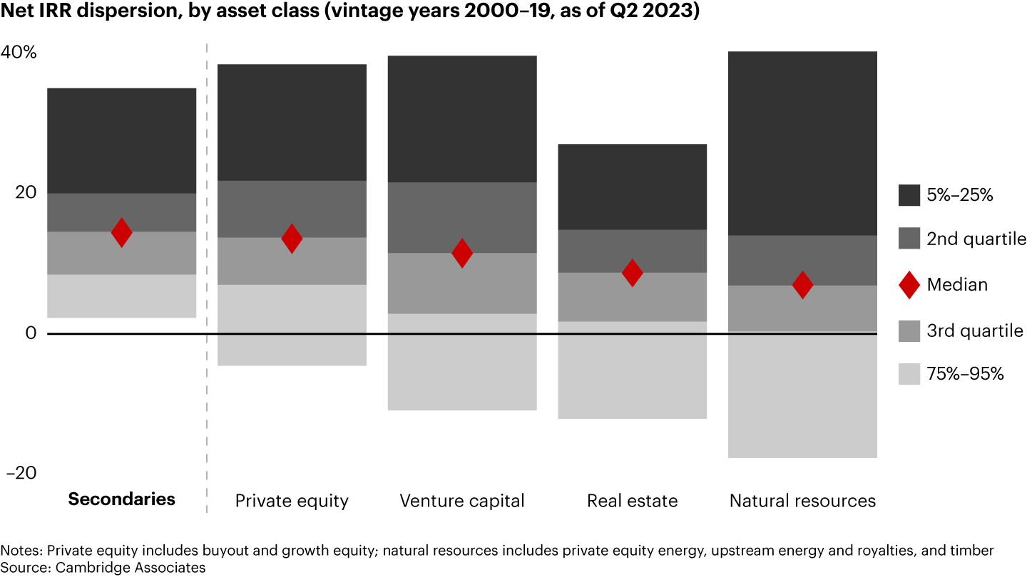 Utility, however, isn’t the only thing fueling the growth of secondaries. Because the fund and company positions at the heart of these products are initially sold at a discount to market value, they also deliver strong, consistent returns for investors with less volatility. Indeed, secondaries are the only alternative asset class in which even the fourth quartile of funds ekes out a positive return (see Figure 1).