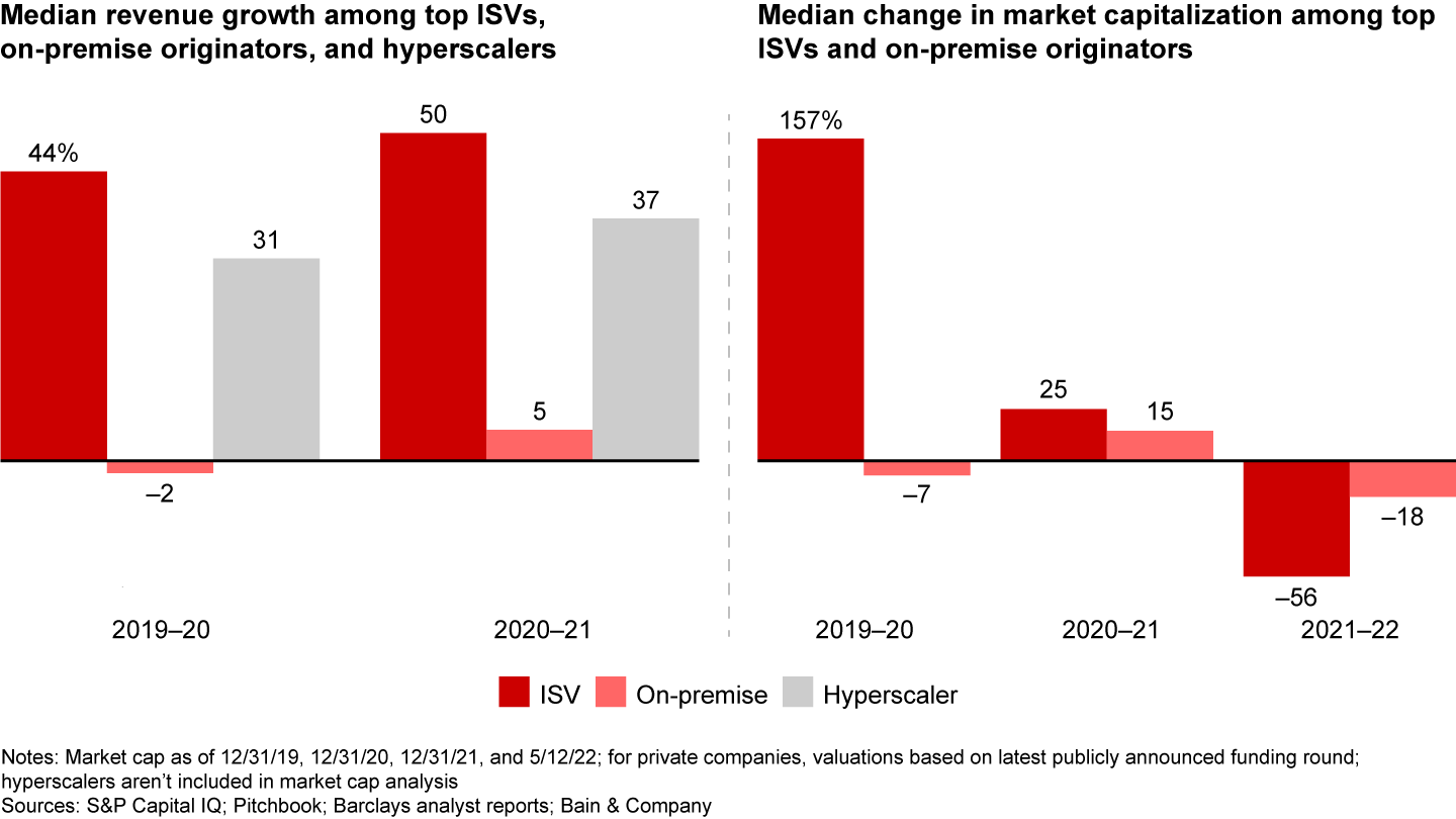 Multicloud ISVs’ rapid growth in value indicated an expectation of transformative market penetration and massive revenue growth over the next few years. Indeed, revenue growth of top multicloud ISVs has exceeded that of both hyperscalers and on-premise originators, increasing by a median of 44% from 2019 to 2020 and 50% from 2020 to 2021 (see Figure 1). Their market valuations increased by a median of 157% from 2019 to 2020 and 25% from 2020 to 2021. Some ISVs enjoyed valuations 50 times higher than their annual revenue, more than triple the average software multiple.