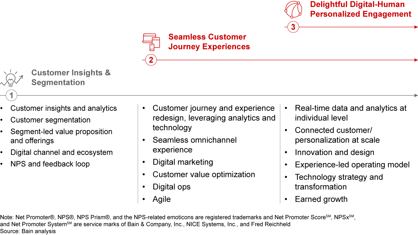 Traditional banks have long-standing relationships and deep customer knowledge to their advantage, but they face more organizational, system, and capability challenges as they transform into customer-centric players. There are three stages of development that traditional banks can follow to improve customer experience (see Figure 7). The starting point may vary based on how sophisticated and customer-centric a bank is today.