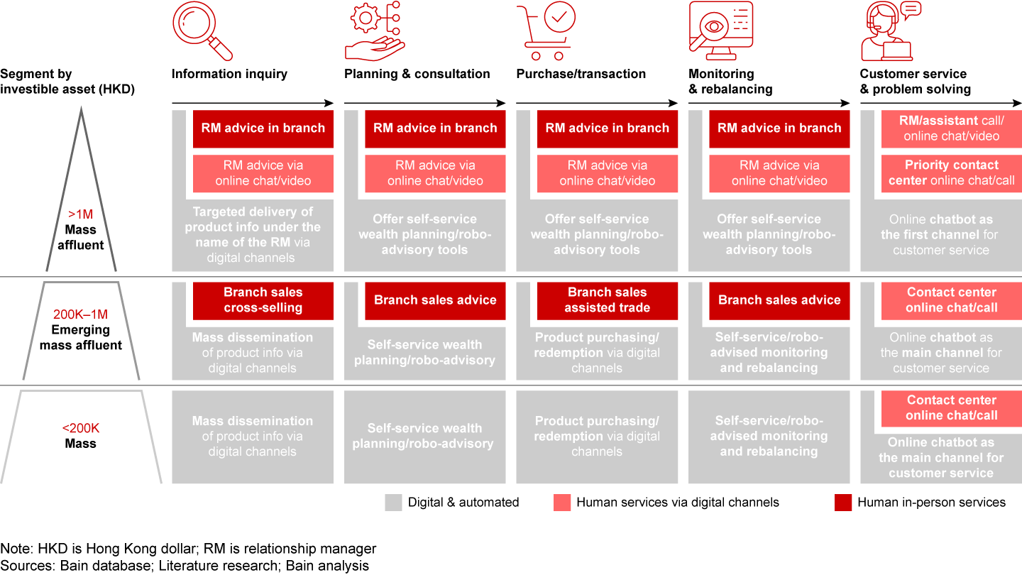 The balance of human touch vs. digital will vary by customer segment and phase of the journey (see Figure 4). For example, major banks could offer human-delivered services to their most affluent consumers in any stage of the journey or channel, but use digital self-services or robo-advisory solutions for the mass market.