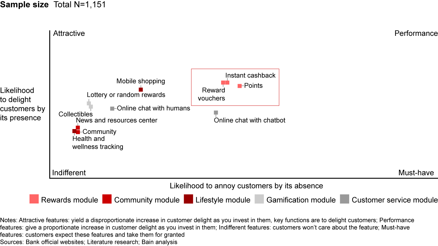 We analyzed how customers ranked nonbanking mobile app features, from news feeds to health trackers and chatbots. Reward features have the highest likelihood to delight customers when offered, or to annoy customers if absent (see Figure 5). Customers appreciate all forms of rewards—vouchers, instant cash back, points—and find them similarly attractive.