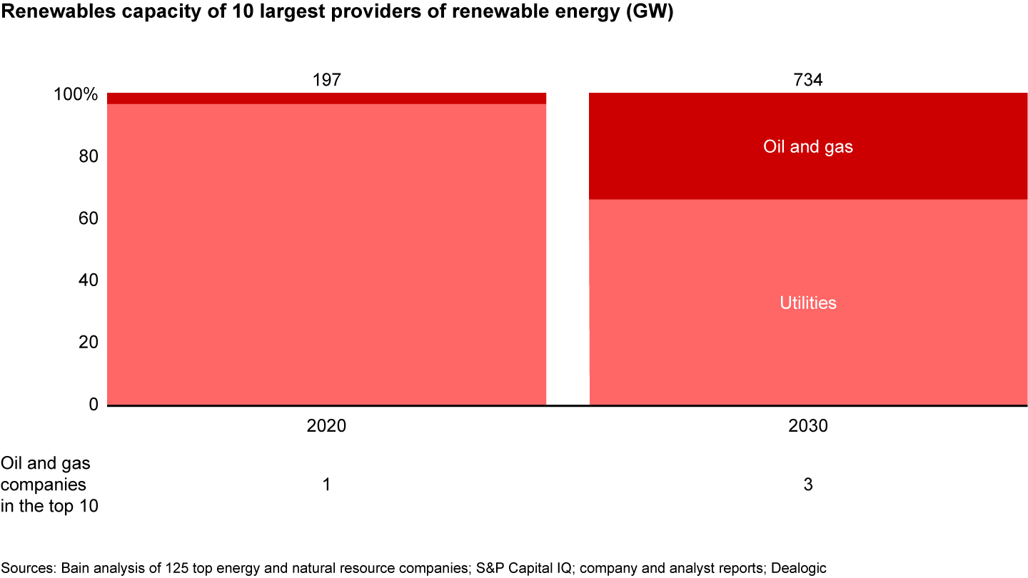 The basis of competition in each market isn’t clear yet, and companies that haven’t traditionally been competitors are now elbowing for market leadership positions. For example, 9 of the top 10 players in renewable generation capacity in 2020 were large power utility companies, but by 2030 at least 3 of the large oil majors are expected to move into the top 10 renewable players, per announced investment plans (see Figure 6).