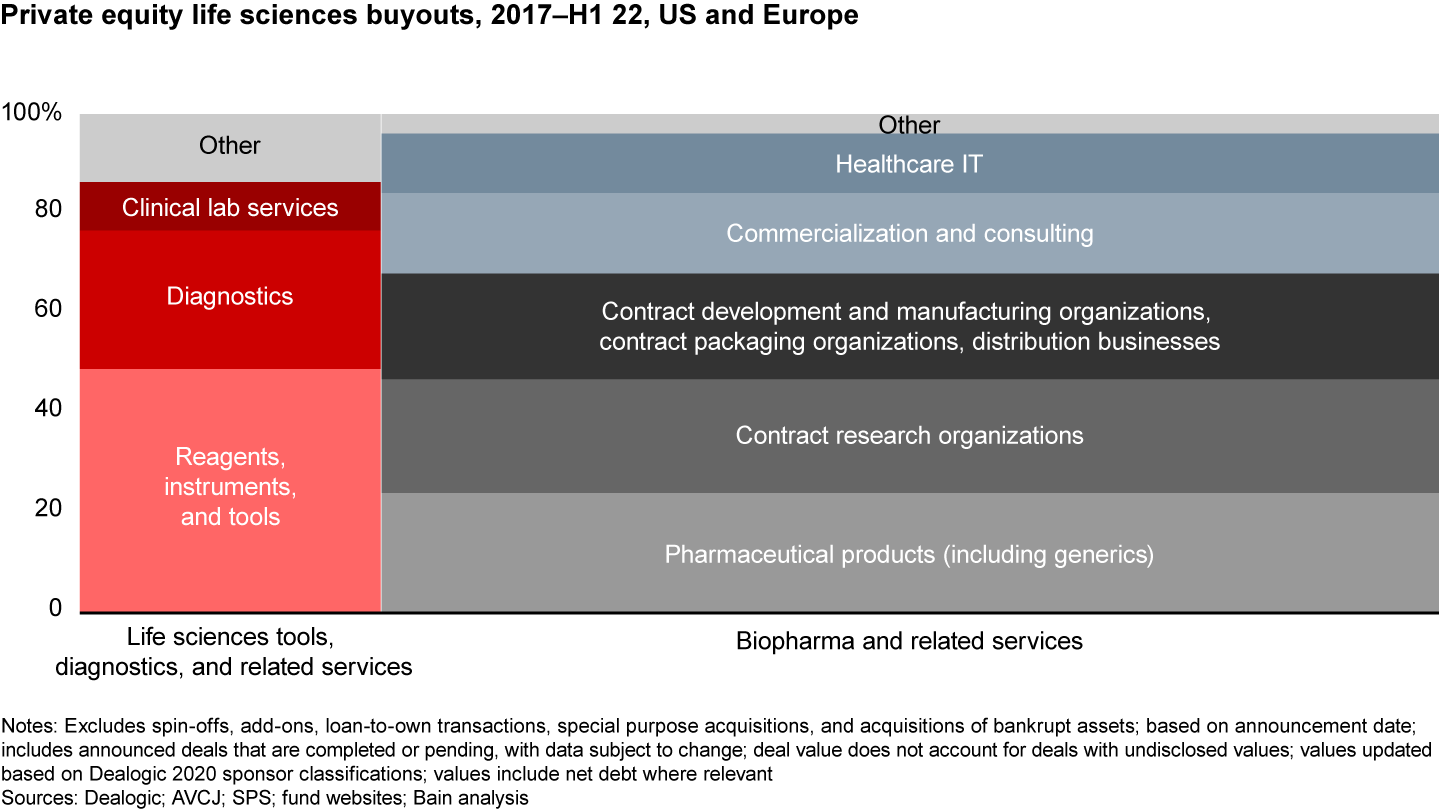 The overwhelming majority of life sciences buyout activity occurred in eight categories