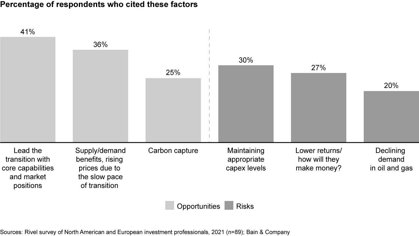 Second, investors see both opportunities and risks associated with how oil and gas companies respond to the energy transition (see Figure 4). They see the potential to use the industry’s capabilities in new, lower-carbon markets, but they’re also concerned about how capital is allocated. Demonstrating how strategy and execution respond to these perspectives should be at the center of oil and gas strategies and investor communications.