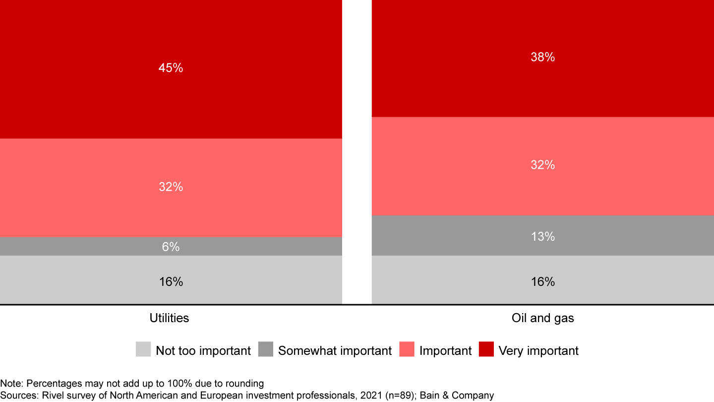 The investors we spoke with give ESG prominent consideration in their investment decisions, but there are differences in how important they believe these factors are and how they use ESG ratings and rankings in their portfolios. More than 70% of investors across utilities and oil and gas described ESG as either very important or important (see Figure 8).