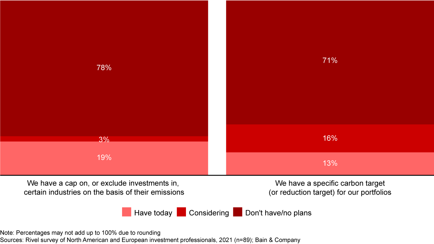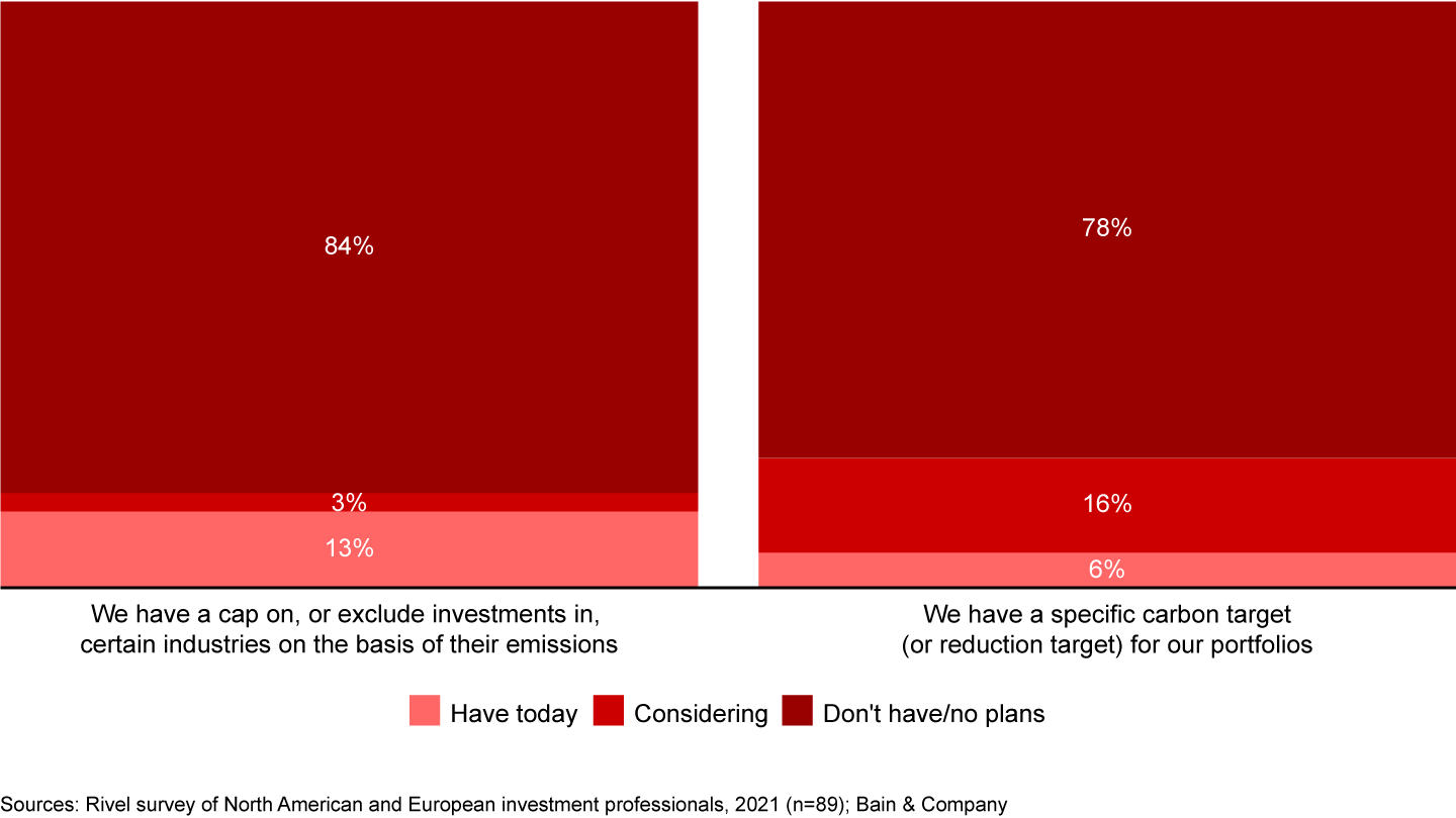 - Many investors are considering using carbon emissions limits, reduction targets, or ESG rankings to guide their portfolio decisions in the future.