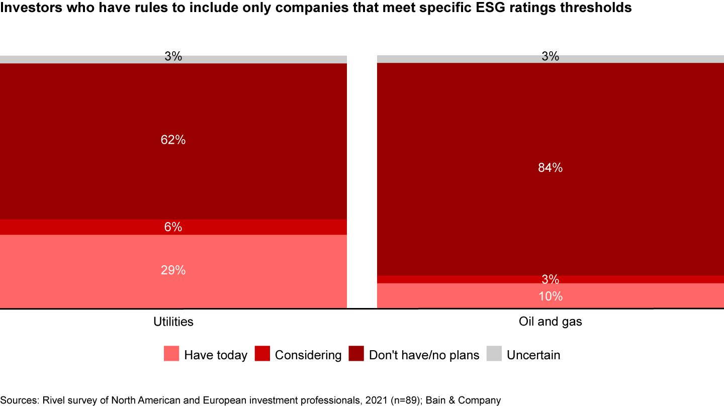 ESG ratings are sometimes used to create rules and limits. Utilities investors are more likely to embed ESG ratings into portfolio decisions: 29% vs. 10% of oil and gas investors (see Figure 9).