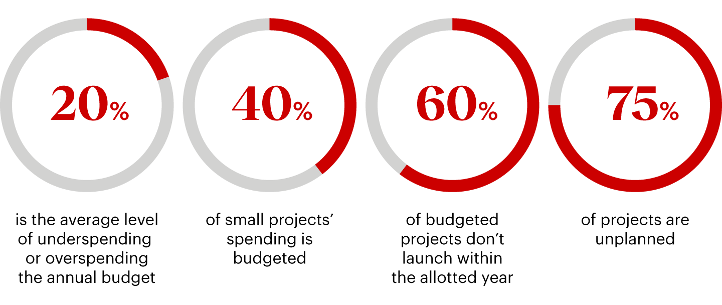 As a result, industrial companies frequently misjudge what’s required and mishandle allocated resources. For example, over a five-year period, one global mining company’s annual sustaining capital spending swung between 20% below and 20% above the budgeted amount (see Figure 2). It achieved an 80% spending compliance rate for larger projects, but it struggled with the long tail of smaller projects—just 40% compliance. Furthermore, about 60% of its budgeted projects didn’t launch within the designated year, and 75% of the sustaining capital projects it did carry out were unplanned.