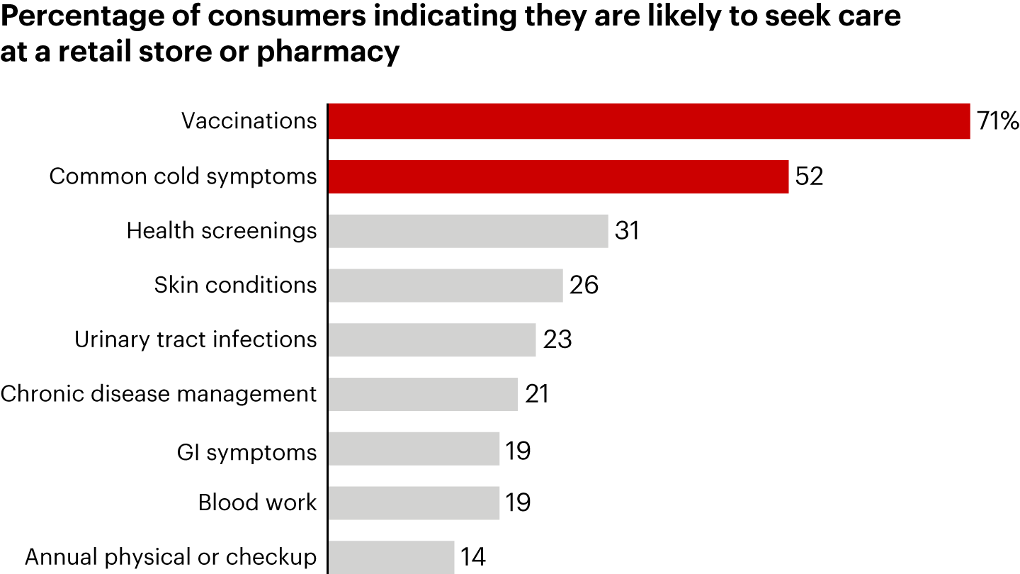 Fewer than a third of consumers report being likely to seek care at a retail store or pharmacy for anything other than vaccinations and cold symptoms