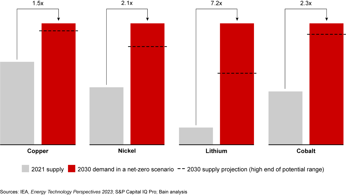 Projected metal and mineral supplies in 2030 fall well short of meeting demand in a net-zero scenario