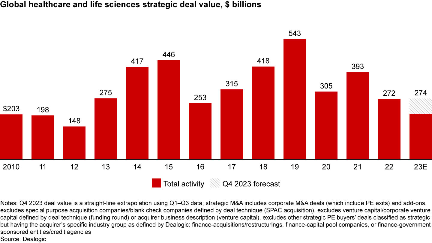 The year saw six deals in excess of $2 billion—the largest being the taking private of Syneos Health by Elliott Investment Management, Patient Square Capital, and Veritas Capital—compared with 13 in 2022 and 14 in 2021, though with some large deals in flux. There have also been around 375 deals below the $2 billion mark, a testament to high levels of activity at the middle and small levels.