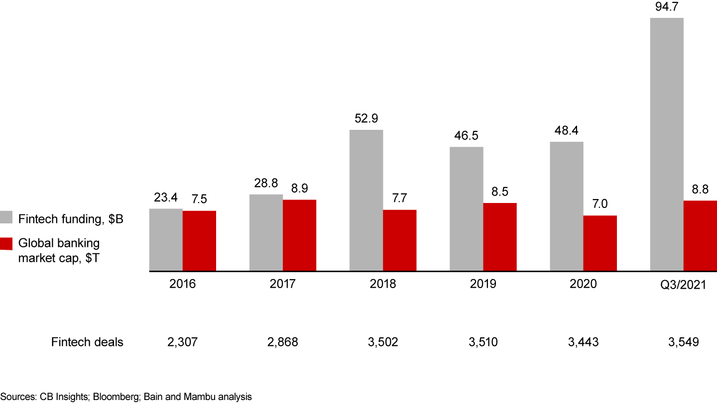 By 2025, US digital-only banks are projected to service almost 20% of the population, reaching more than 53 million account holders, up from 29 million in 2021. At the same time, incumbents’ failure to meet customer demand for digital services has translated into an impressive increase in fintech funding—while the market capitalization of banks overall has increased only slightly (see Figure 1).