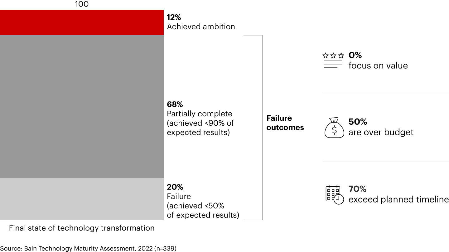 With so much at stake, why do so many companies miss the mark? From the get-go, a tech- vs. business-led approach can quickly put companies on the wrong foot. While tech-focused programs strengthen technical infrastructure and address software obsolescence, true transformation requires a wider lens: tech expertise, plus the business sponsorship and pragmatism required to tackle underlying business issues and drive meaningful change.