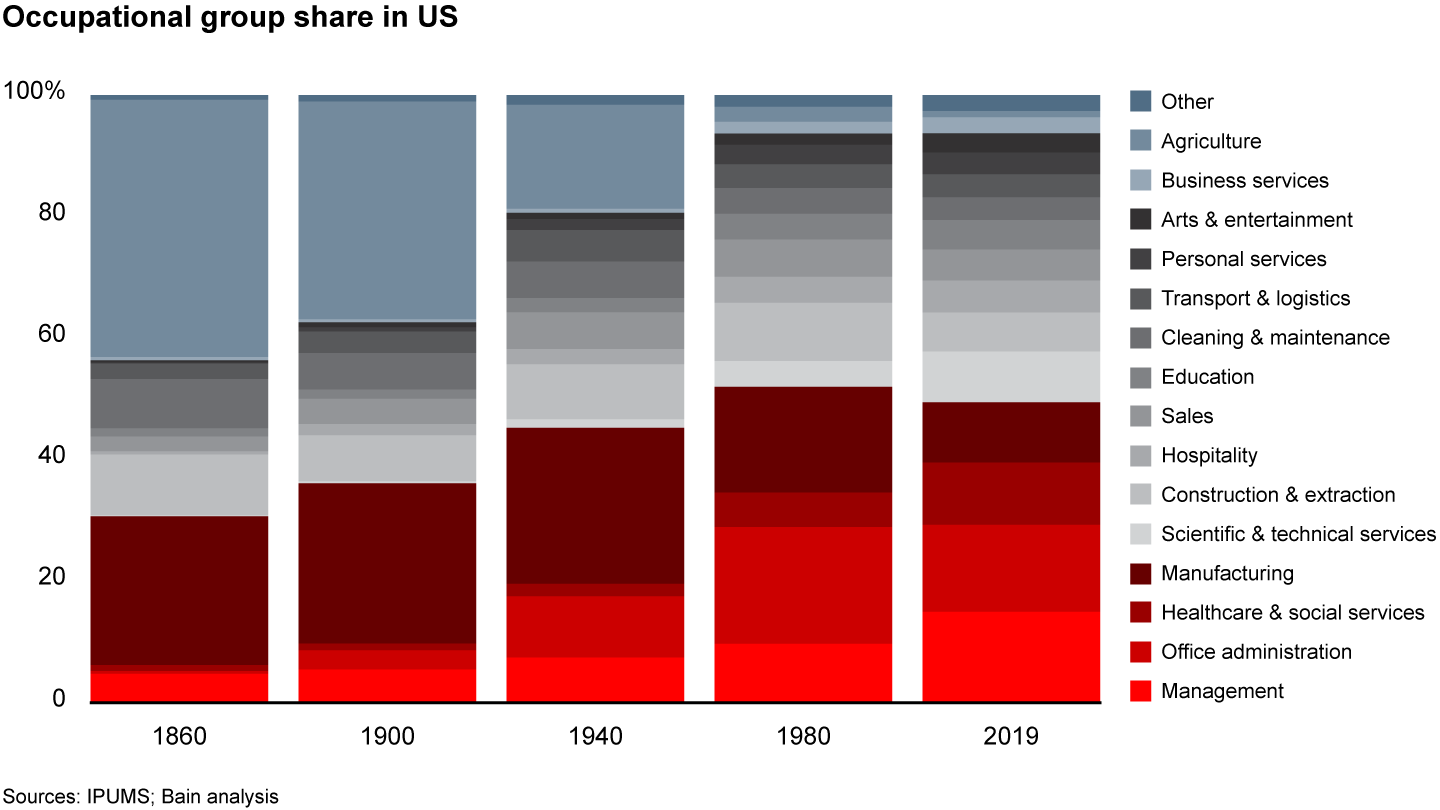 So far, at least, technological progress has not led to the end of work. But it has propelled numerous cycles of profound change in the role humans play in the economy. Over the past 150 years, technology has interacted with parallel structural forces, such as globalization, shifting consumer tastes, and demographic changes, to continuously redefine the mix of work (see Figure 3.2).