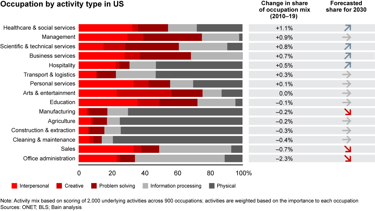 To understand how this shifting occupational mix will affect the capabilities required by future workers, we classified more than 2,000 underlying activities across occupations into five categories (see Figure 3.3):