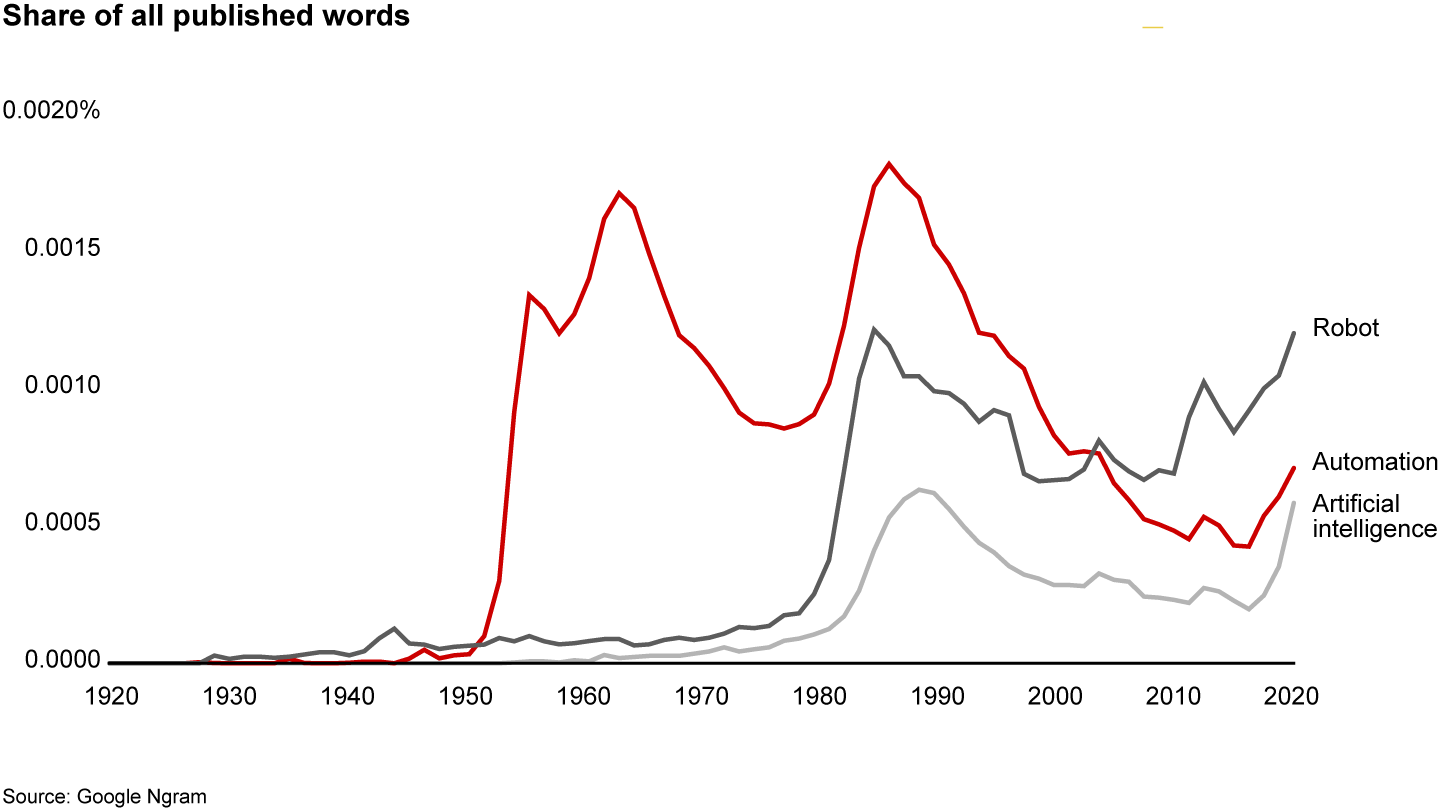 Over the past century, fears of mass joblessness from automation have come and gone in waves (see Figure 3.1). During World War II, mass labor shortages led to significant advances in the mechanization of production. Firms introduced these innovations into civilian production in the 1950s and 1960s, much to the consternation of workers. In the 1980s, a surge of interest and investment in the burgeoning field of artificial intelligence, combined with the growth of the personal computer, led to a second wave of fears around job-killing machines. The zeitgeist was reflected in blockbuster sci-fi hits including Blade Runner, The Terminator, and Star Wars.