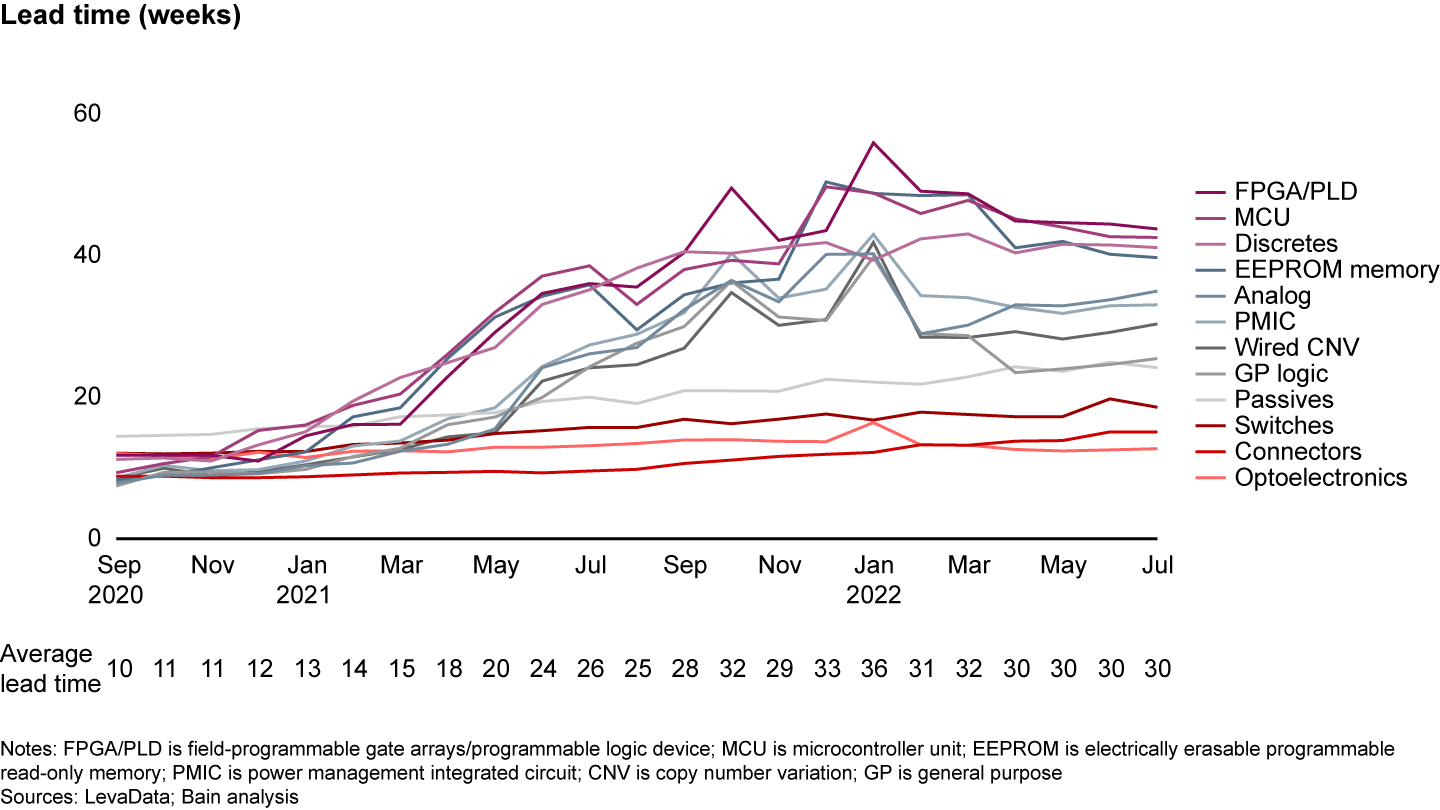 Some chip types (and the industries that rely on them) have been hit harder and at different times. After shooting up in 2021, lead times for chip deliveries have flattened at elevated levels in recent months (see Figure 2).