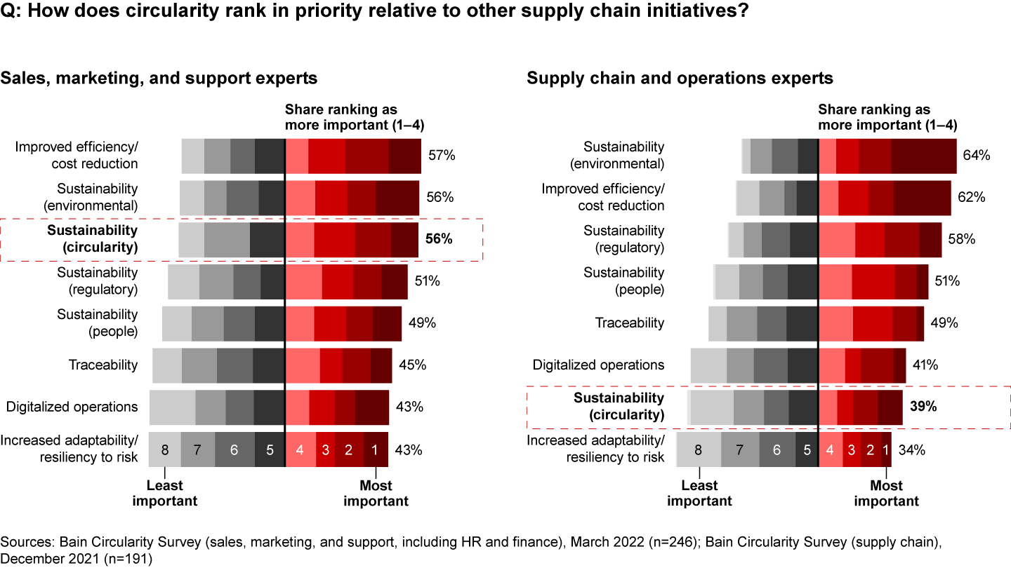 - Executives recognize that circularity is a strategic issue, but they don’t agree on how to prioritize it.