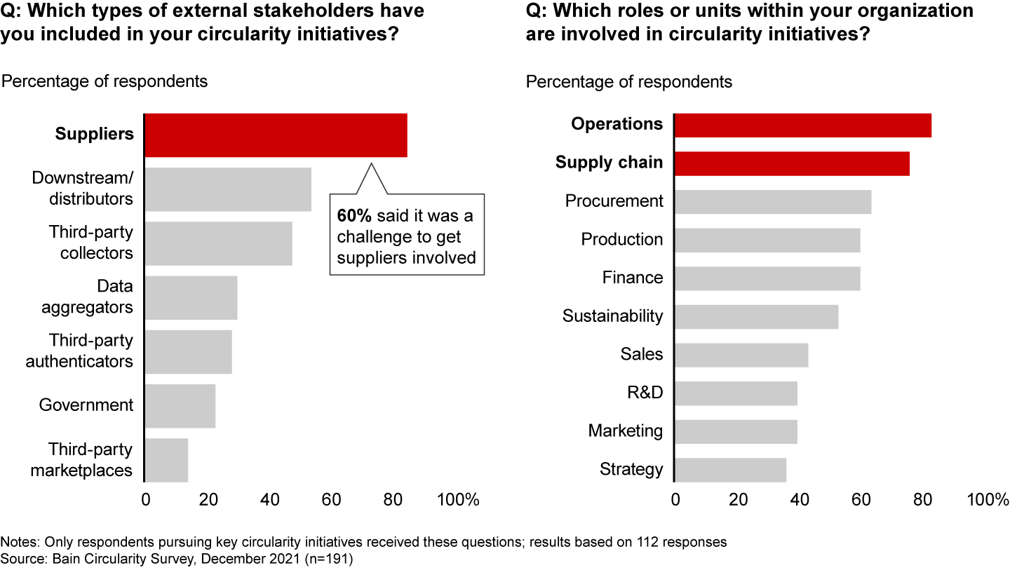 Another obstacle for circularity initiatives is getting the needed engagement from a broad set of external stakeholders. Suppliers rank as the most vital external partners in circularity initiatives, but 60% of companies said getting them involved was a challenge (see Figure 3).