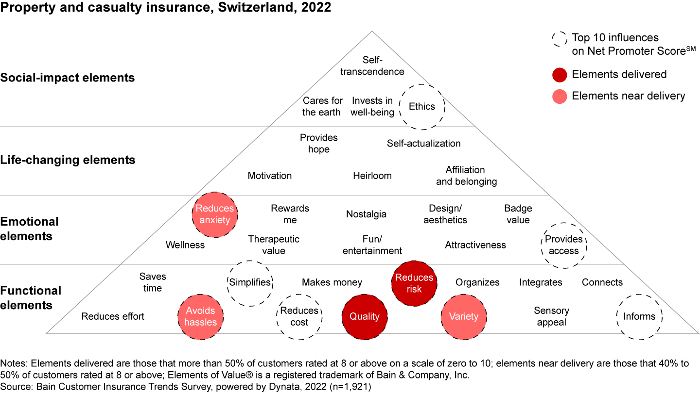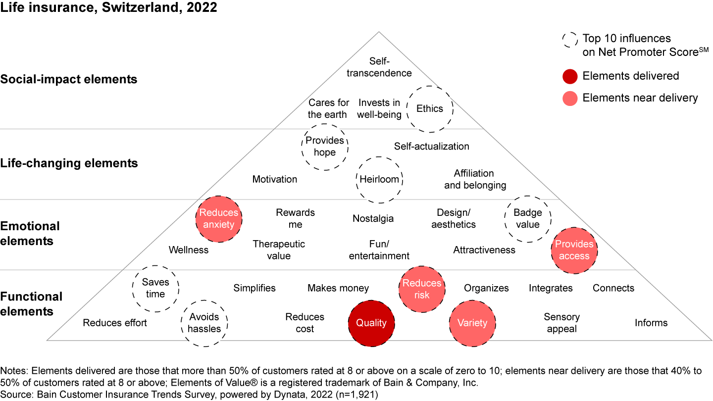 - Consumers increasingly emphasize higher-order Elements of Value for insurance, such as ethics, and for life insurance, provides hope and heirloom. However, insurers currently aren’t delivering a lot of value on these elements, in consumers’ view.