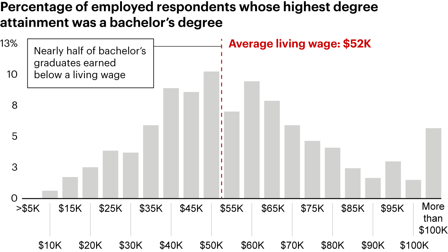 - Nearly half of bachelor’s degree holders still earn less than a living wage, and the average student debt of those in our sample was $13,000.