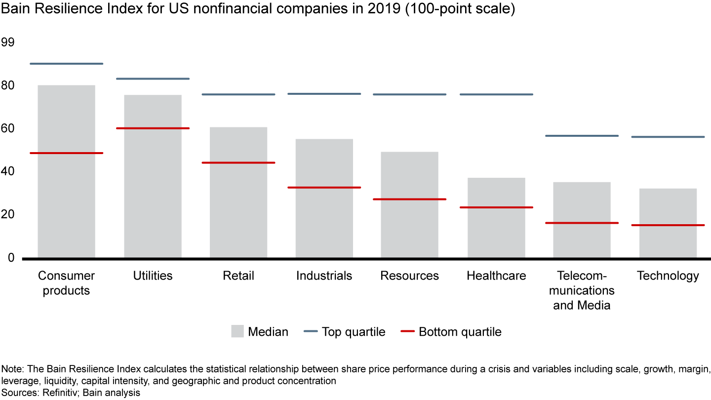 One sticking point in this dialogue concerns disagreement over the right metrics. To that end, we’ve constructed the Bain Resilience Index, a 100-point scale that assesses a company’s resilience based on the statistical relationship between performance during a crisis and a wide range of readily observable metrics including scale, growth, margin, asset intensity, leverage, liquidity, and geographic and product concentration. While these metrics offer only a partial assessment of resilience, understanding one’s relative position on these basic dimensions will serve as a useful start for any fact-based dialogue with investors.