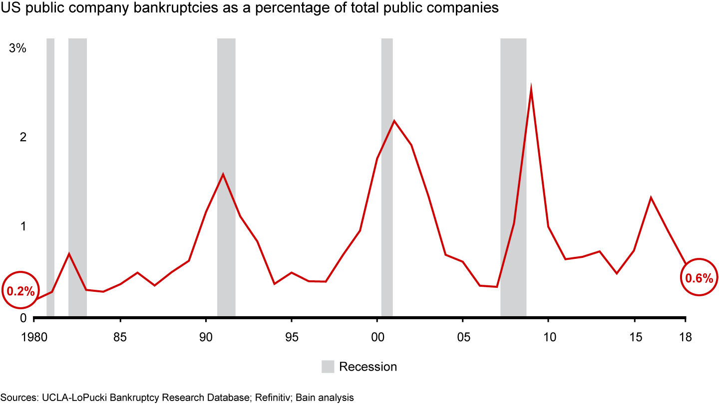 At a macro level, the fixation on streamlining and efficiency has steadily increased risk. Comparing the periods 1980–1999 with 2000–2018, we found that the volatility of the aggregate profit pool in developed economies increased by 60% (see Figure 1). At the firm level, this volatility is coinciding with a higher probability of failure (see Figure 2). Looking at public US firms, the bankruptcy rate tripled between 1980 and 2018. Both aggregate volatility and business failure rates would have been far higher if not for an unprecedented level of government support.