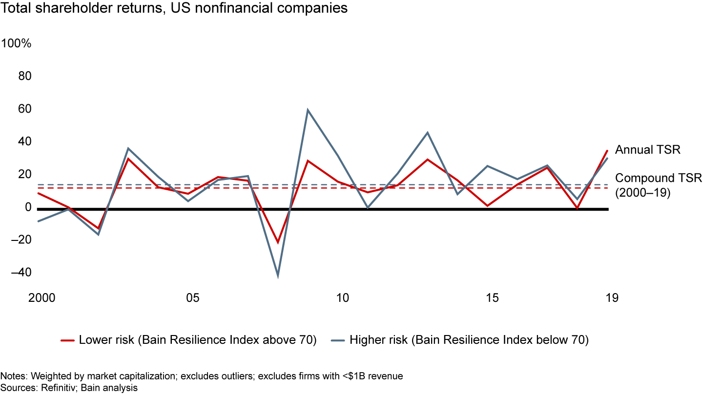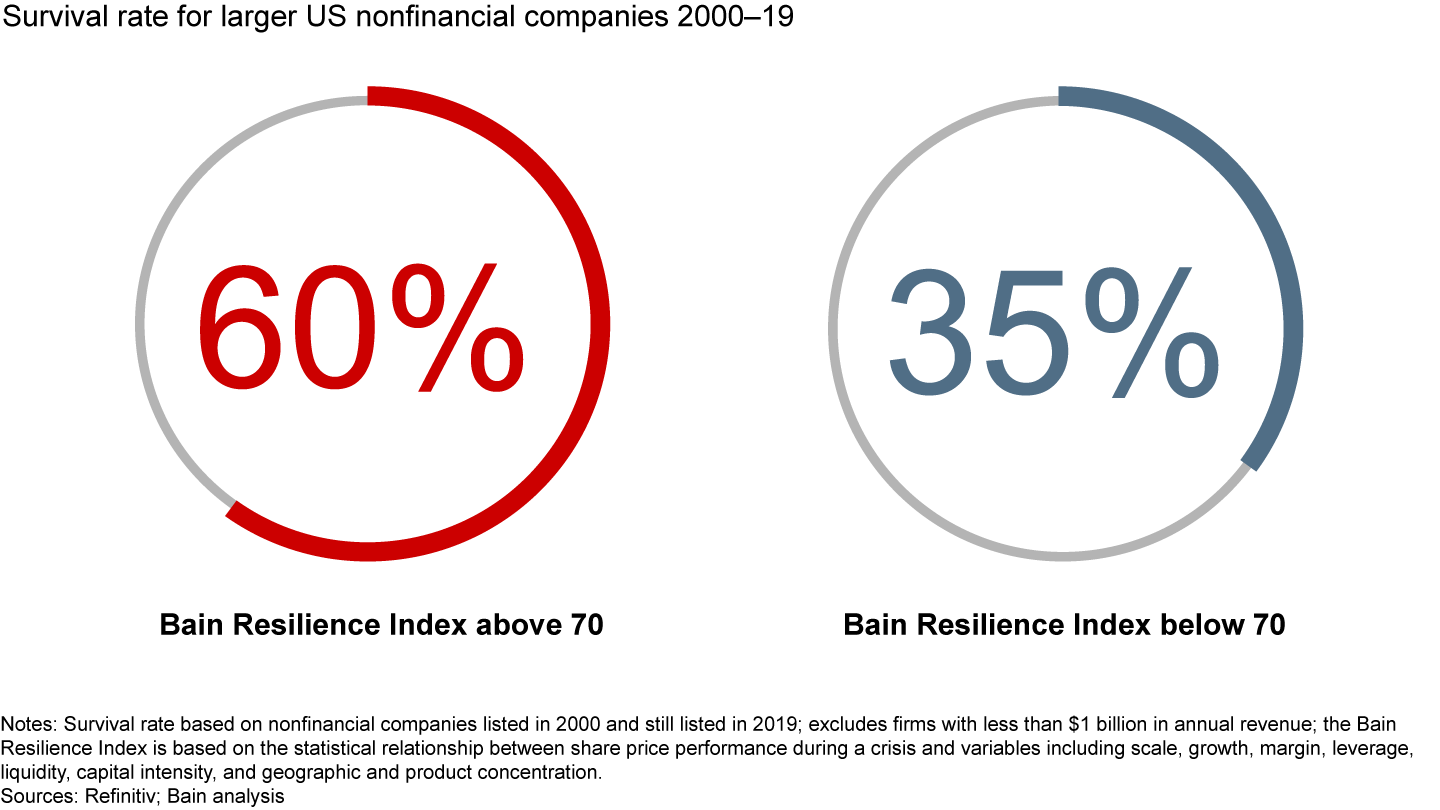 • Analysis of the Bain Resilience Index shows that while high risk can generate high rewards, more-resilient companies have nearly double the survival rate over the long run.