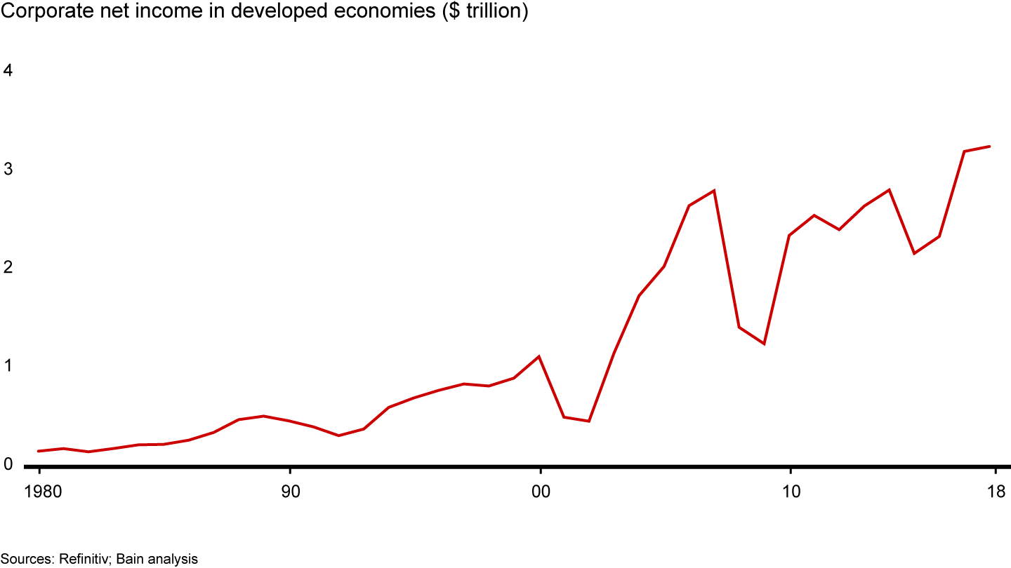 How did we land in this predicament? The stability of recent decades enabled the fastest growth in profits since the middle of the 20th century; from 1990 to 2018, the profit pool of companies in developed economies grew at more than double the rate of GDP. Through this period, the relative predictability of the business environment enabled firms to pursue efficiency that helped fuel this exceptional profit growth.