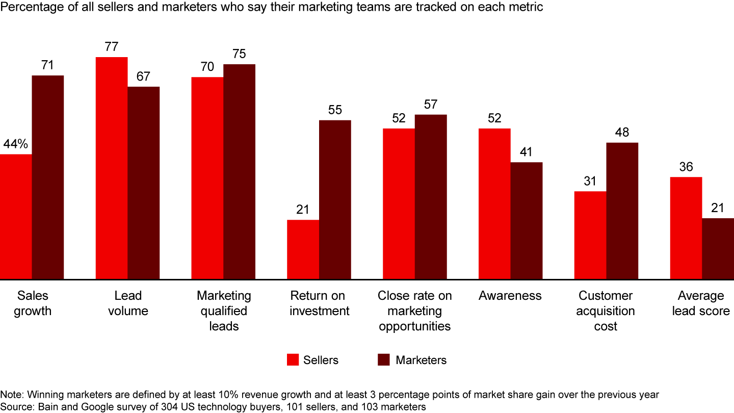 Implications: Marketing and sales groups must collaborate closely at each stage of the funnel. At one software-as-a-service company, the sales group contributes to marketing’s lead scoring rubric, while marketing helps shape sales’ response to potential deals. Sales can also include marketing in pipeline reviews and account discussions, and marketing can include sales on brand initiatives and channel strategy discussions. Metrics should be consistent across the marketing organization, focusing more on revenue growth.