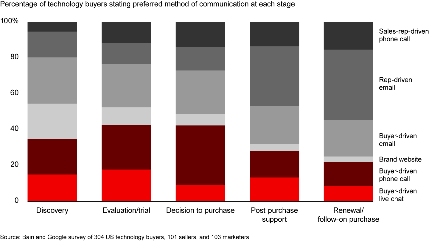 Implications for technology providers: Make it easy and convenient for early-stage prospects to learn about how the company’s offerings deliver value. Engage purchase-ready customers earlier in the sales conversation, but make processes flexible enough that they don’t force all buyers through the same stage gates. Prospects who are not yet ready to buy could be passed back to marketing.