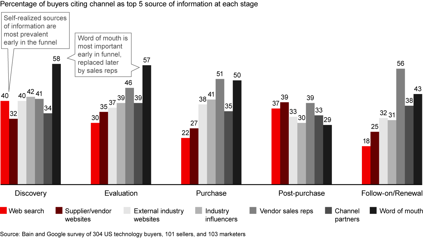 Marketers’ and sellers’ historical roles have tinged their perceptions of how customers behave during the purchase process. Each overstates their own role in what customers rely on. Marketers routinely assume the company website is the most important channel, and underestimate the importance of the various paths to arrive there. Sellers overestimate buyers’ use of sales reps and channel partners. By contrast, buyers favor word of mouth early on, and use social media mainly to consume content and learn about trends and brands, rather than actively engaging with vendors.