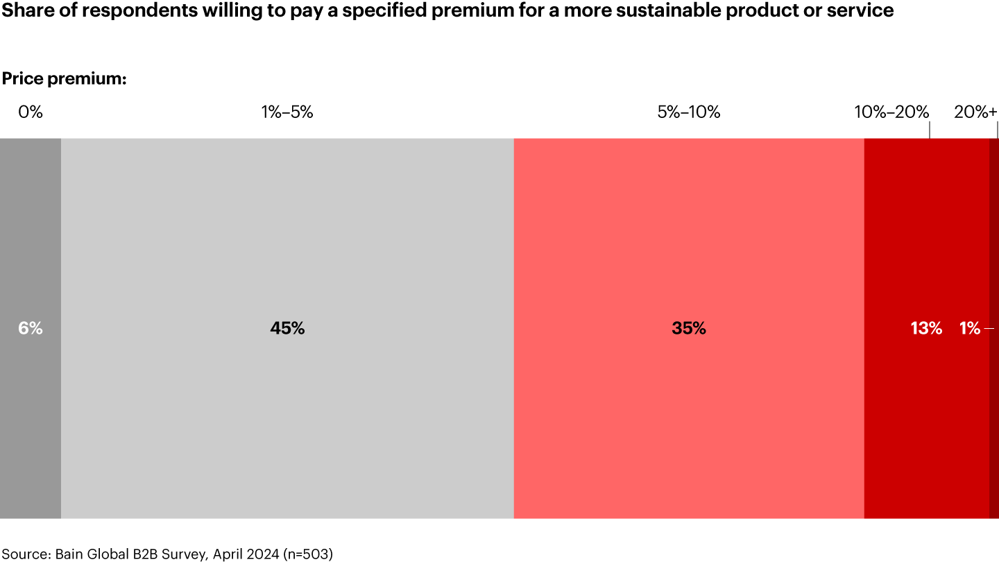 Today two-thirds of customers report having a low or average understanding of what justifies the price of their suppliers’ sustainable offerings. Some 45% don’t believe their suppliers clearly state the financial return on that investment, limiting their willingness to pay a premium. There is clearly room for companies to better construct and communicate their sustainable value propositions.