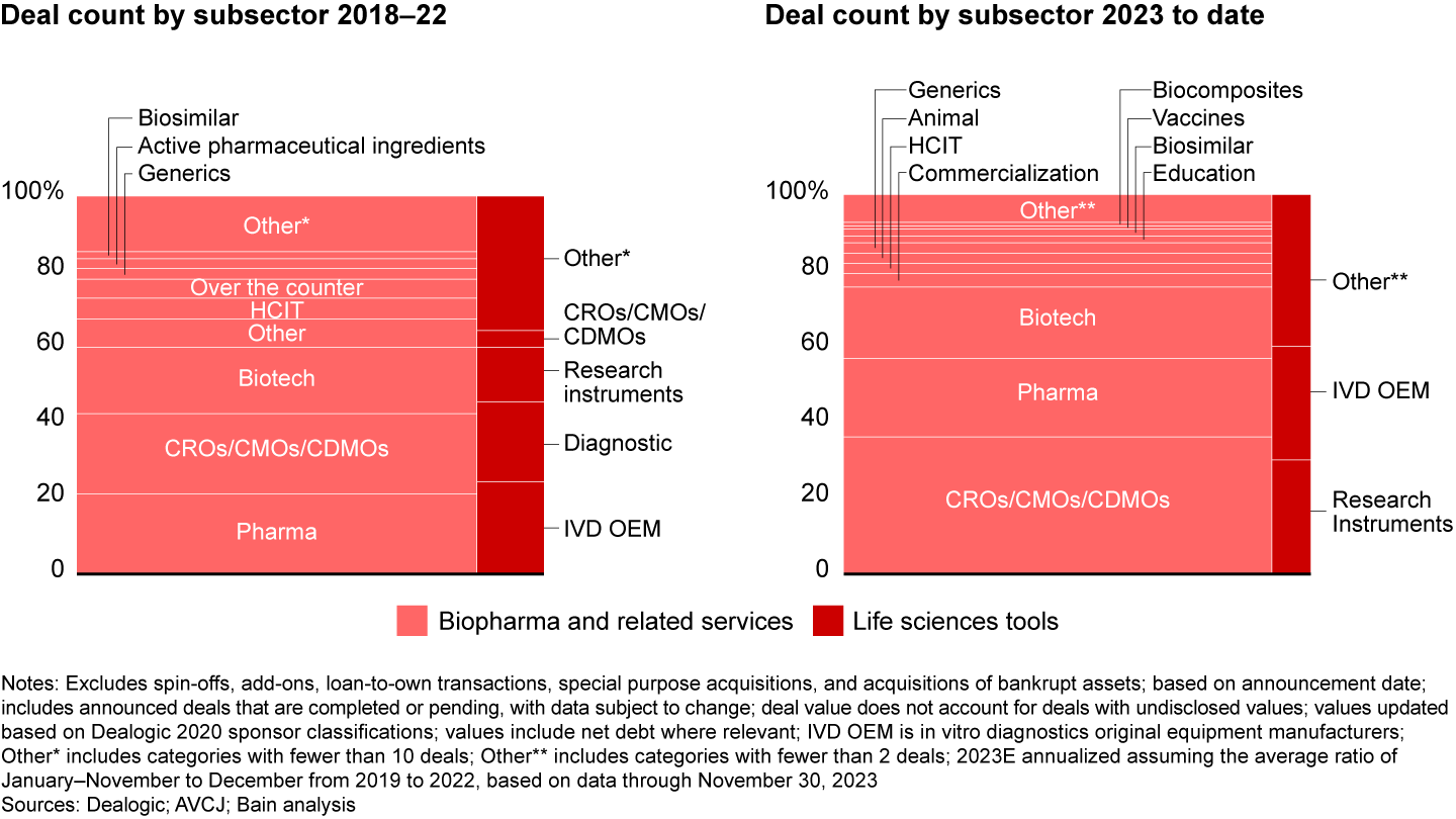 2023 brought a larger share of deals in CROs, CMOs, and CDMOs than in previous years