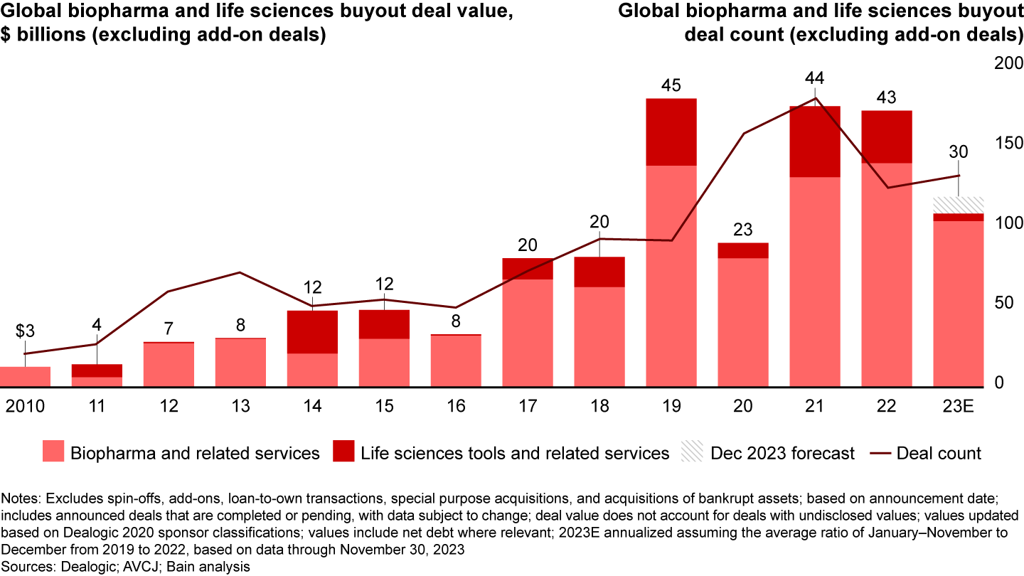 • Although the life sciences sector continues to attract buyout activity, private equity deal value in 2023 struggled to match the levels of 2022.
