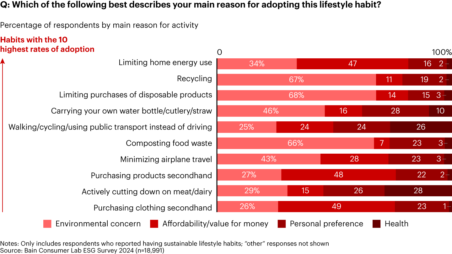 For example, there is a consistent view in developed markets that living sustainably is inherently more expensive (see Figure 3). That isn’t always true. Some consumers, while trying to save money, are adopting habits that also happen to be more sustainable, such as driving less, buying secondhand clothing, and, in some cases, actively cutting down on meat and dairy (see Figure 4). But the common perception that a sustainable lifestyle is expensive poses a challenge for brands, especially amid intensified cost-of-living worries. Conversely, consumers in some fast-growing markets believe that living more sustainably would actually cost them less. The frugal behavior they associate with sustainability could lead to an overall reduction in demand and consumption, complicating companies’ growth plans.