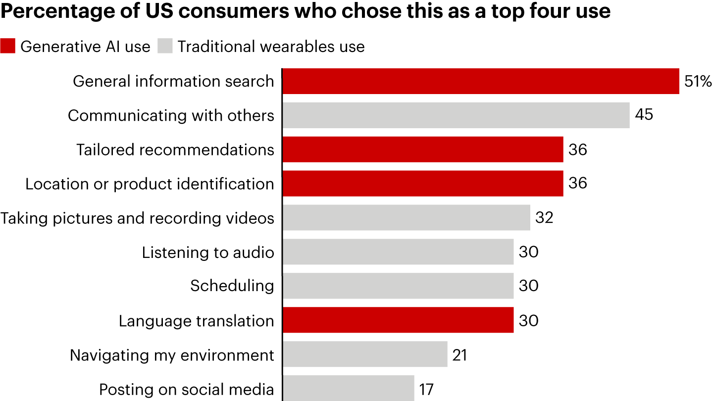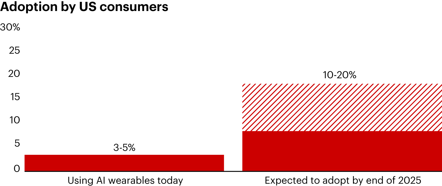 Source: Bain–Dynata Generative AI Consumer Survey, December 2024 (n=1,117)Why is the market taking off now? Consider the introduction of Ray-Ban Meta glasses, which in just over a year reportedly sold more than 2 million units, outpacing earlier products in the consumer space. Google Glass’ technical design and vague uses struck some consumers as too beta, and Snapchat Spectacles’ bold design and limited functionality alienated the mass market. By contrast, Meta partnered with EssilorLuxottica (parent company of Ray-Ban) to pair stylish design with cutting-edge AI technology. The familiar and socially acceptable appearance makes these Ray-Bans easy to wear in everyday life, while the glasses’ capabilities enhance consumers' daily lives. The timing is also better: Products like the Apple Watch have normalized wearable technology, at a moment when many consumers are interested in exploring the possibilities of AI. The result is a product that is both functional and fashionable, paving the way for broader adoption.