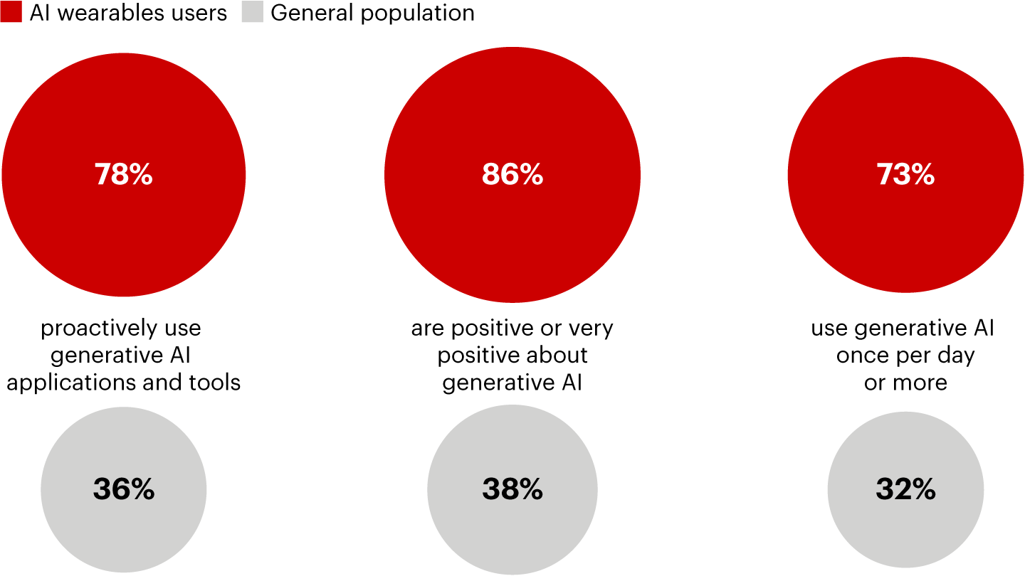 Compared with the general population, adopters of AI wearables are about twice as likely to use other generative AI tools, view generative AI positively, and use it daily (see Figure 3).